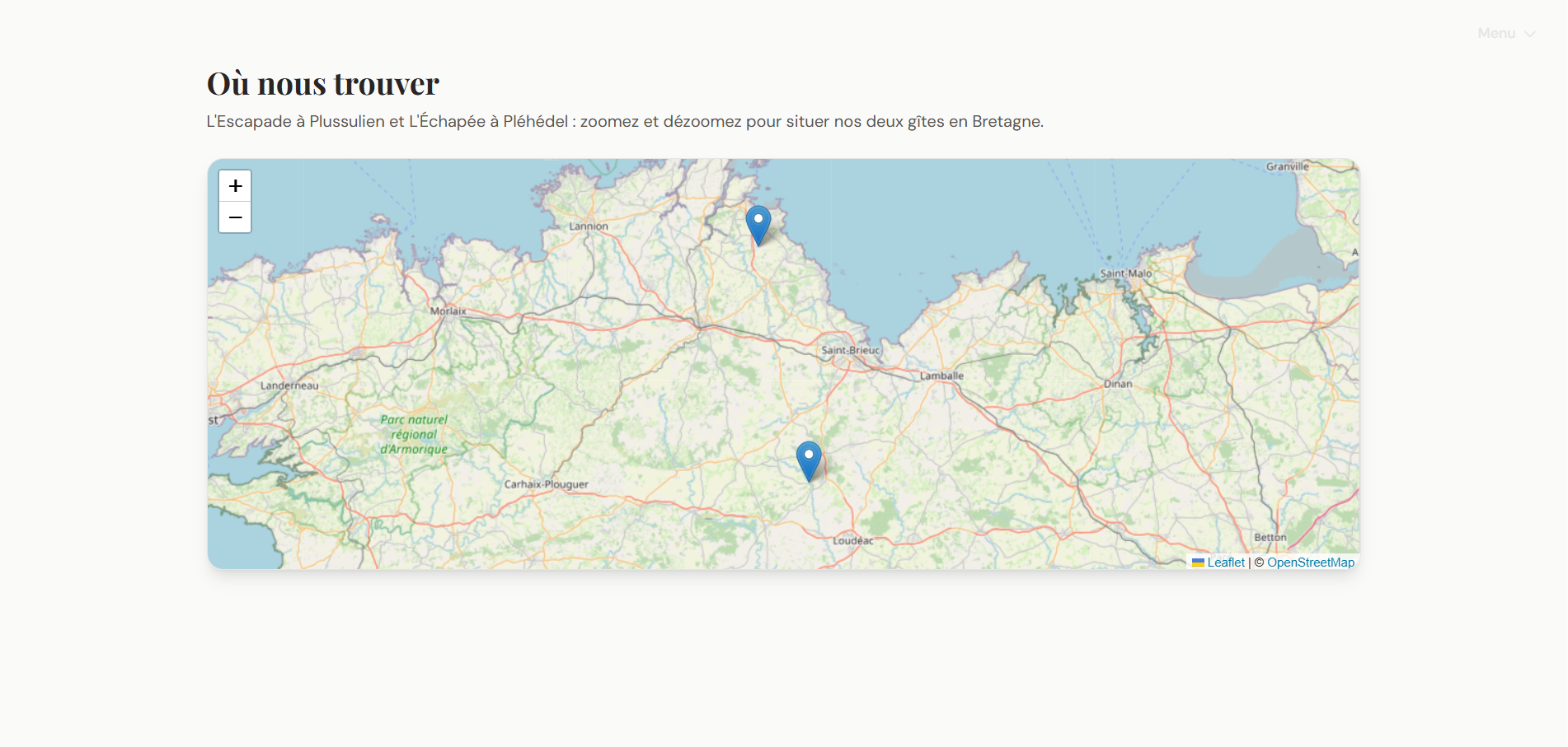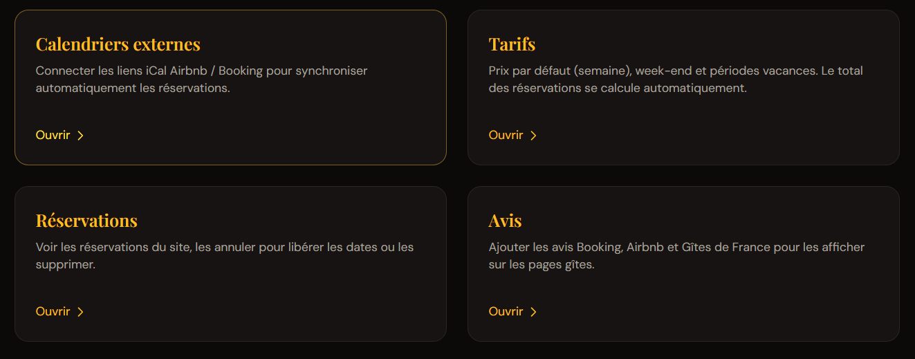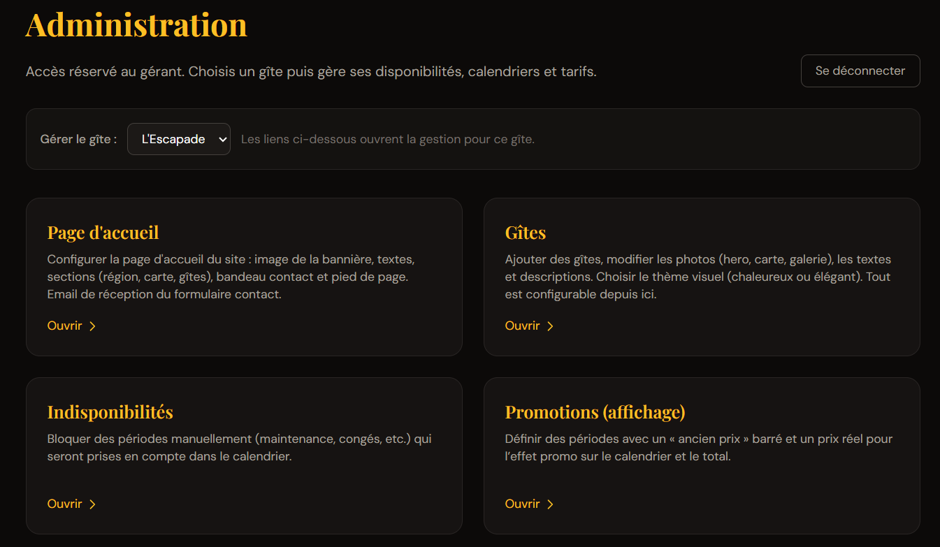 Page d’accueil, carte interactive, fiches gîtes, calendrier de réservation et tableau de bord admin en un seul outil.