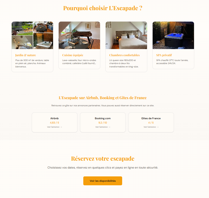 3 captures de votre page d’accueil (hero, liste des gîtes, carte, etc.).