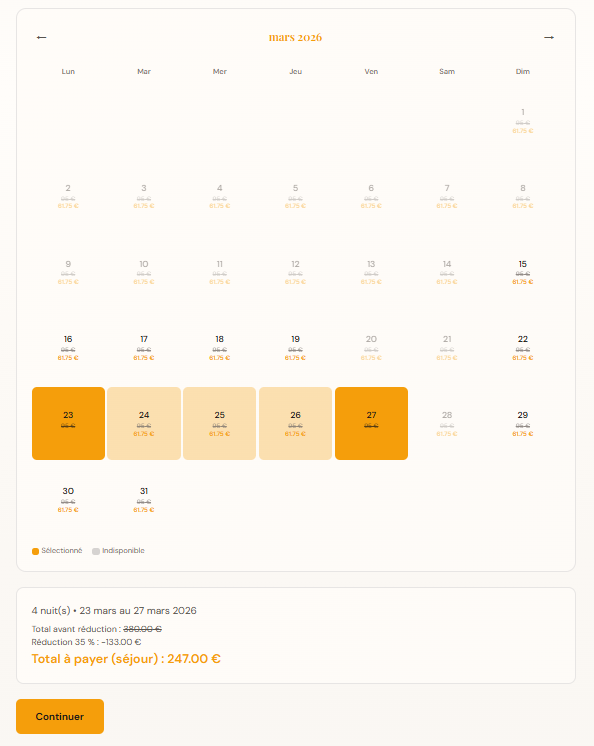 Modifiez textes, photos, tarifs et promotions. Bloquez des dates, gérez les avis clients et personnalisez le thème de votre site.