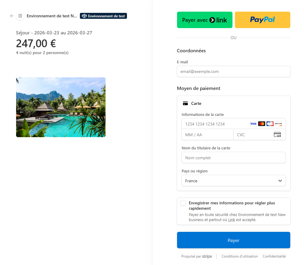 Stripe : carte bancaire, Apple Pay, PayPal. Encaissement direct sur votre compte.