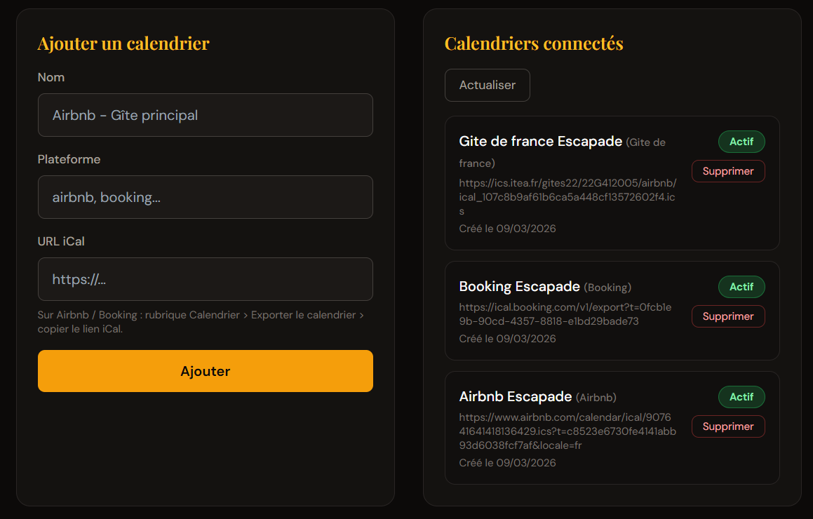 Un seul calendrier synchronisé avec Airbnb, Booking.com, Gîtes de France et autres plateformes (iCal). Plus de double réservation.